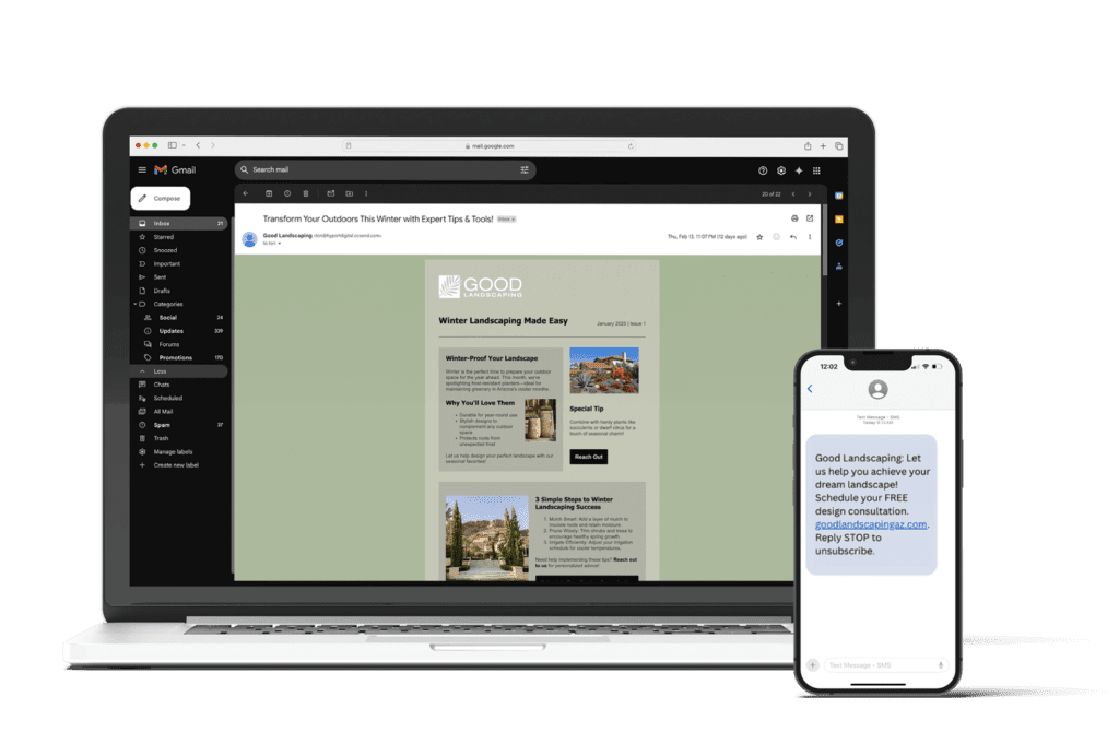 Each month, you'll receive two branded emails and one text written specifically for your business. We take care of the copywriting, design, scheduling, and reporting, all aligned with your goals.